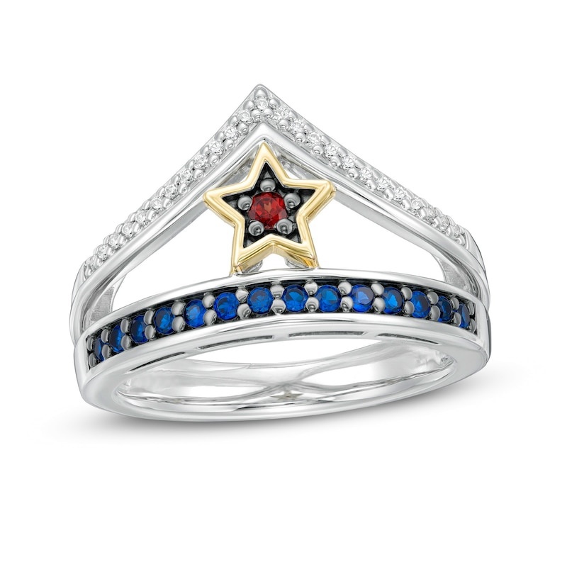 Crafted in sterling silver, this openwork style features a regal red garnet set in a 10K yellow gold star. A row of brilliant sapphires and a V-shaped diamond ribbon accentuate the center, creating a tiara-like look. Enchanting with 1/15 carat diamonds and a brilliant polish, this selection is an epic take on modern design. This ring is only available in size 7. Sterling silver rings cannot be resized after purchase.